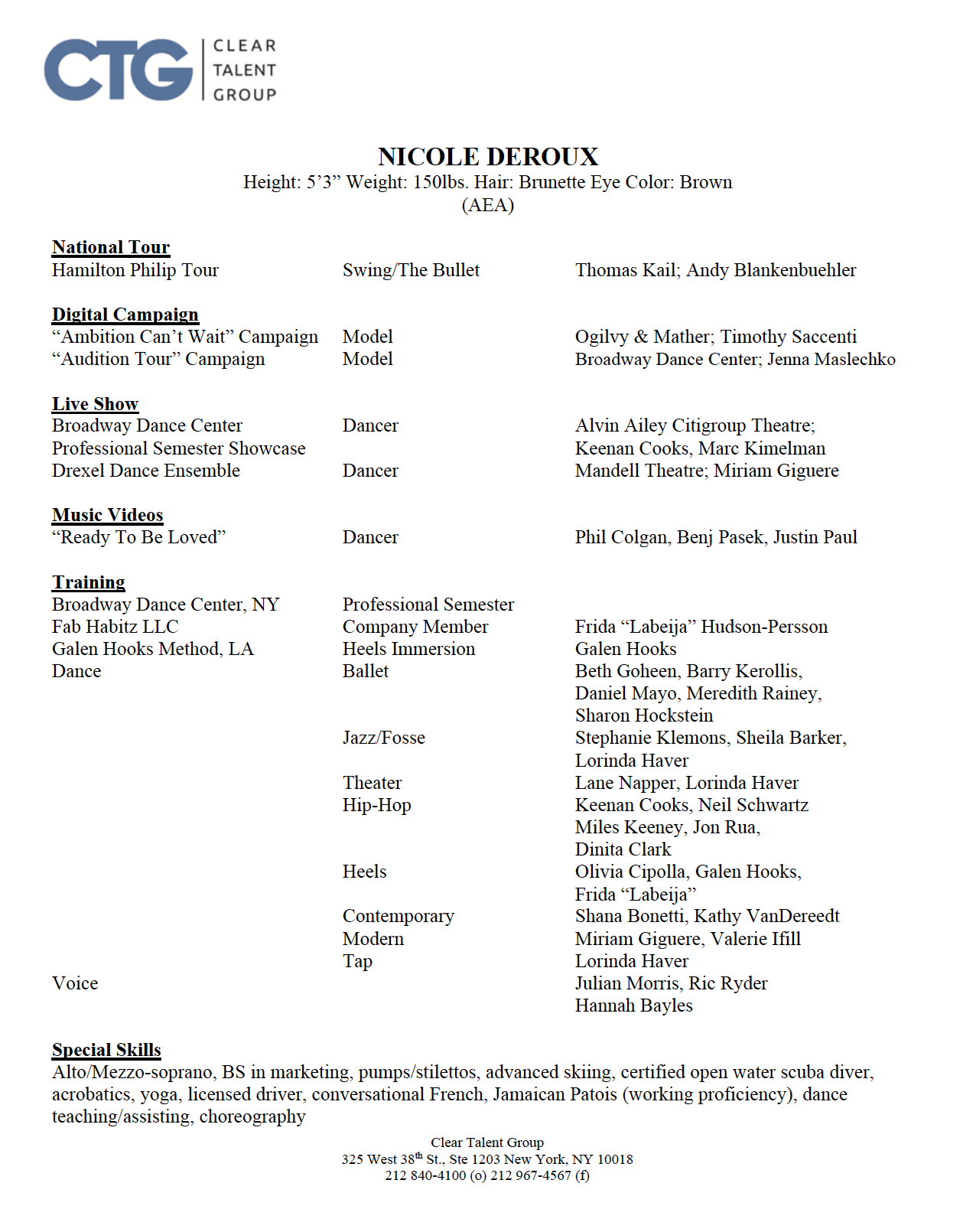 Nicole deRoux is a professional dancer, signed with Clear Talent Group. She is currently touring North America with the Hamilton Philip Company.